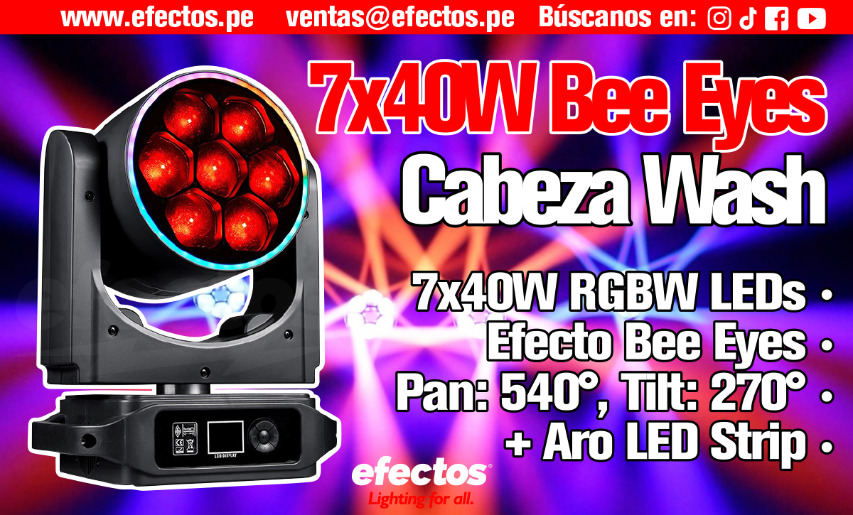 Versión potente para discotecas y escenarios, y lo mejor en versión en cabezas wash. Configura y programa en modo cabeza wash o bee eyes para tu escenario y eventos nocturnos.