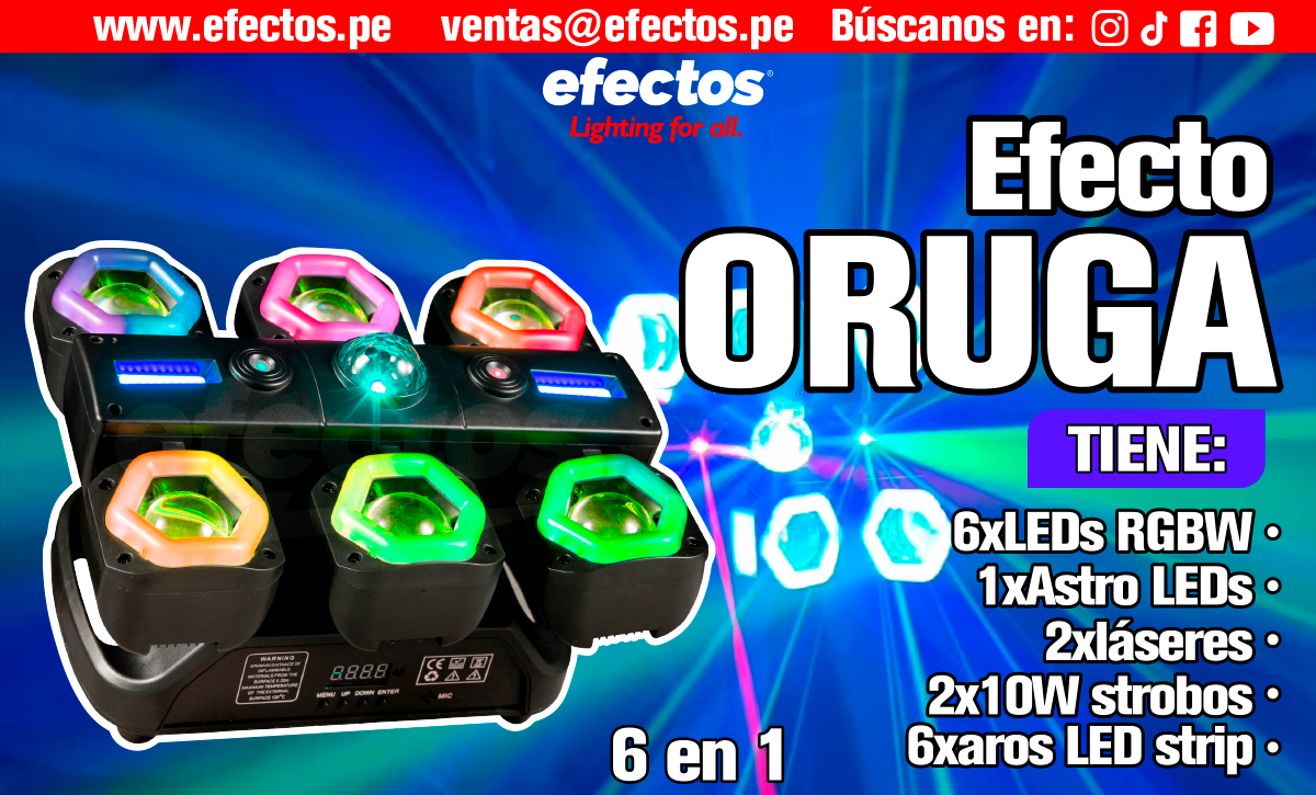 ¡Nueva generación de luces! Un efecto tipo helicóptero de 6 brazos, combina bien con sus 2 láseres rojo y verde. Forma muchos diseños con sus LEDs strip.