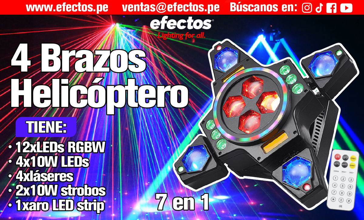 ¡Nueva generación de luces! Este efecto combina 4 Cabezas móviles y muchas otras funciones en un solo equipo. Usalo en tus fiestas, karaokes y más.